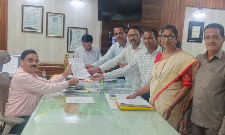 जिल्हाधिकारी यांना निवेदन देताना महासंघाच्या जिल्हा उपाध्यक्षा प्रा. मेघा अलासे, कार्याध्यक्ष प्रा. विजयकुमार शिंदे, सचिव प्रा. सुनील गवारी, जिल्हा कोषाध्यक्ष प्रा.सचिन टोपकर व प्रा.महावीर अलासे हे उपस्थित होते.
