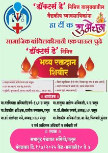 डॉक्टर्स डे निमित्त आरोग्य विभाग पं. स.पलूस यांच्यावतीने 1 रोजी रक्तदान शिबिर
