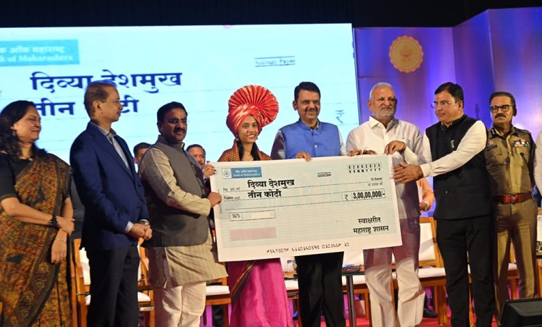 शालेय शिक्षण व क्रीडा विभाग आणि महाराष्ट्र बुद्धिबळ संघटना यांच्या संयुक्त विद्यमाने जागतिक बुद्धिबळ स्पर्धा विश्वविजेती ग्रँडमास्टर दिव्या देशमुख हिचा नागरी सत्कार कविवर्य सुरेश भट सभागृह येथे आयोजित करण्यात आला. यावेळी मुख्यमंत्री श्री. फडणवीस बोलत होते. मुख्यमंत्र्यांच्या हस्ते दिव्याचा सन्मान करीत तीन कोटी रुपयांचे बक्षीस प्रदान करण्यात आले. महाराष्ट्र बुद्धिबळ संघटनेकडूनही ११ लाख रुपयांचे बक्षिस प्रदान करण्यात आले. तसेच खासदार क्रीडा महोत्सव समितीकडूनही सन्मान करण्यात आला.