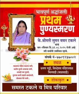 दर्पण न्यूज भिलवडी /माळवाडी :- सांगली जिल्हा पलूस तालुक्यातील भिलवडी माळवाडी येथील शिव मल्हार हिंदुस्थान क्रांती सेनेचे सांगली जिल्हा अध्यक्ष ऋषी टकले यांच्या मातोश्री कै.सुमन बबन टकले यांचा रविवार दिनांक 31 रोजी सकाळी प्रथम पुण्यस्मरण दिनाचा कार्यक्रम आयोजित करण्यात आला आहे.