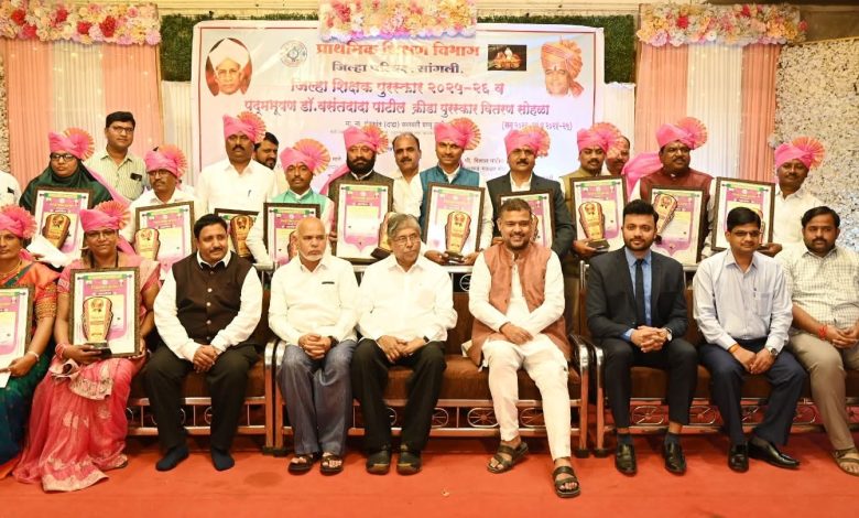यावेळी मान्यवरांच्या हस्ते जिल्हा शिक्षक पुरस्कार 2025-26 व पद्मभूषण डॉ. वसंतदादा पाटील क्रीडा पुरस्कार सन 2023-24 व 2024-25 चे वितरण करण्यात आले. प्रारंभी मान्यवरांच्या हस्ते दीप प्रज्वलन करण्यात आले. स्वागत व प्रास्ताविक शिक्षणाधिकारी (प्राथमिक) मोहन गायकवाड यांनी केले. कार्यक्रमास पुरस्कार प्राप्त शिक्षक, खेळाडू यांच्यासह त्यांचे नातेवाईक तसेच शिक्षक, शिक्षिका, नागरिक मोठ्या संख्येने उपस्थित होते.