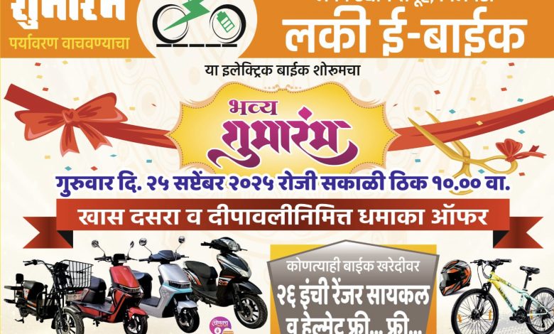 दर्पण न्यूज भिलवडी :- सांगली जिल्हा पलूस तालुक्यातील भिलवडी व पंचक्रोशीमध्ये प्रथमच लोकांच्या सेवेसाठी लकी उद्योग समूह, भिलवडी यांनी लकी ई-बाईक दालन सुरू केले आहे. या इलेक्ट्रिक बाईक शोरुमचा गुरुवार दि. २५ सप्टेंबर २०२५ रोजी सकाळी ठिक १०.०० वा. शुभारंभ आहे.
