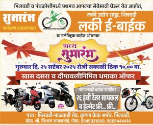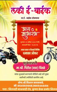 दर्पण न्यूज भिलवडी :- सांगली जिल्हा पलूस तालुक्यातील भिलवडी व पंचक्रोशीमध्ये प्रथमच लोकांच्या सेवेसाठी लकी उद्योग समूह, भिलवडी यांनी लकी ई-बाईक दालन सुरू केले आहे. या इलेक्ट्रिक बाईक शोरुमचा गुरुवार दि. २५ सप्टेंबर २०२५ रोजी सकाळी ठिक १०.०० वा. शुभारंभ आहे.