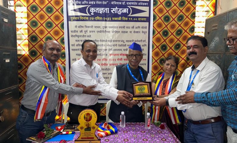मुंबई : गुरुवार, दि. २७ एप्रिल २०२३* : मुंबई पोर्ट ट्रस्ट च्या सीएमई विभागाच्या ओपीएल, वडाळा खात्यातील मुख्य समयपाल प्रतिम भिकाजी जाधव हे चाळीस वर्षांची निष्कलंक, प्रामाणिकपणे सेवा करून सेवानिवृत्त झाले.या सेवानिवृत्ती कार्यक्रमाला ‘कृतज्ञता सोहळा’ असे स्वरूप देण्यात आले होते. ‘पुस्तक भेट द्या, पुष्पगुच्छ नको!’ या स्वरूपात इतर कोणतीही भेट सन्मानपूर्वक नाकारत संपन्न झाला.