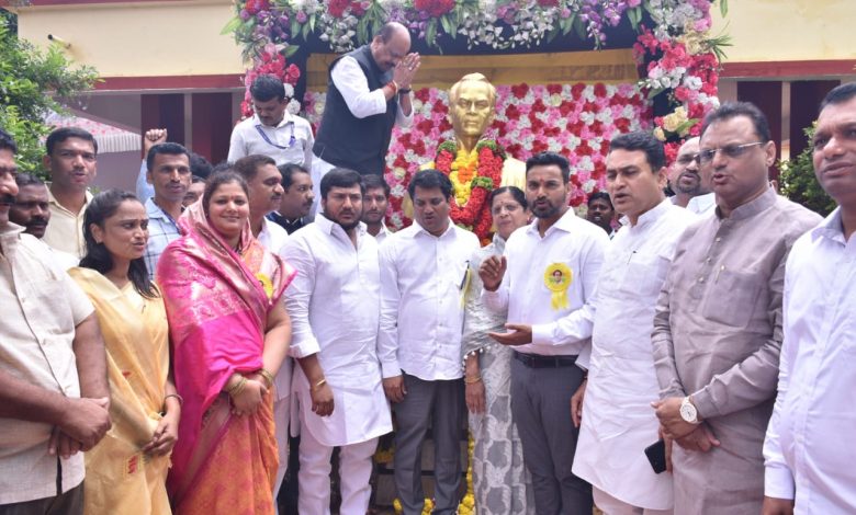सांगली : वाटेगाव येथे साहित्यरत्न लोकशाहीर अण्णा भाऊ साठे यांच्या १०३ व्या जयंतीनिमित्त त्यांच्या पुतळ्यास पुष्पहार अर्पण करून कामगार मंत्री तथा जिल्ह्याचे पालकमंत्री डॉ. सुरेश खाडे यांनी आज अभिवादन केले.