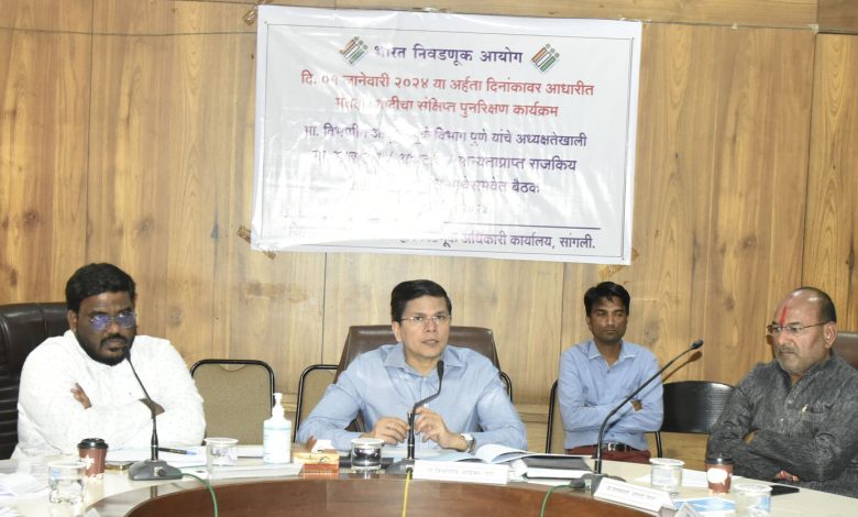 दिनांक 1 जानेवारी 2024 या अर्हता दिनांकावर आधारित मतदार याद्यांच्या विशेष संक्षिप्त पुनरिक्षण कार्यक्रमाच्या आढावा बैठकीच्या अध्यक्षस्थानावरून ते बोलत होते. जिल्हाधिकारी कार्यालयातील बैठक कक्षात झालेल्या या बैठकीस खासदार संजय पाटील, जिल्हाधिकारी डॉ. राजा दयानिधी, उप जिल्हा निवडणूक अधिकारी नीता सावंत-शिंदे, सर्व उप विभागीय अधिकारी, तहसिलदार, मान्यताप्राप्त राजकीय पक्षाचे जिल्हाध्यक्ष / प्रतिनिधी उपस्थित होते.