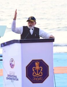 पंतप्रधान नरेंद्र मोदी आज सिंधुदुर्ग येथे आयोजित ‘नौदल दिन 2023’ च्या मुख्य कार्यक्रमाला उपस्थित होते. सिंधुदुर्ग येथील तारकर्ली समुद्रकिनारी भारतीय नौदलाची जहाजे, पाणबुड्या, विमाने आणि विशेष दलांची ‘थरारक प्रात्यक्षिके ’ यांचे त्यांनी निरीक्षण केले. मोदी यांनीगार्ड ऑफ ऑनर सोहळ्याची पाहणी केली.