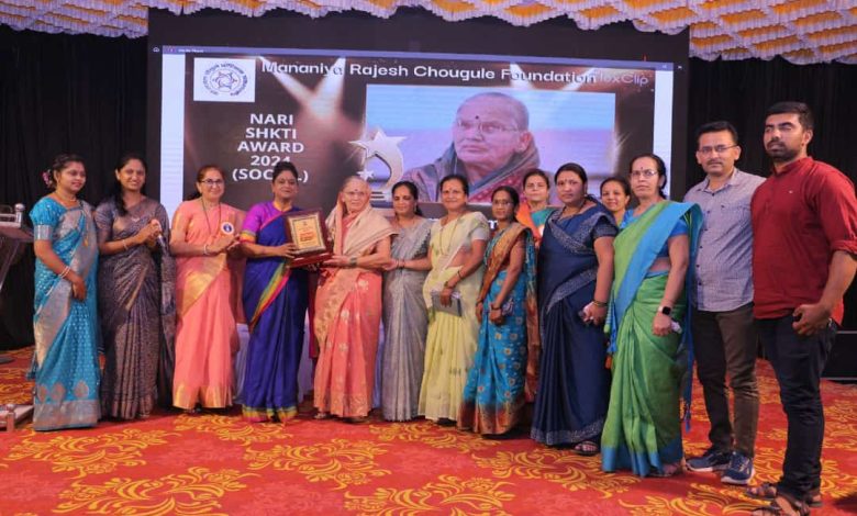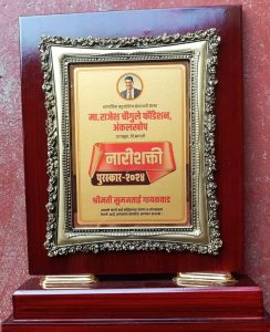 राजेश चौगुले फौंडेशन कडून त्यांच्या सामाजिक कार्याबद्दल “नारीशक्ती जिवनगौरव” पुरस्काराने सन्मानित करणेत आले. हा पुरस्कार प्रसिद्ध डाॕक्टर.निलीमा लिमये, फौडेशनच्या अध्यक्षा शितल चौगुले यांच्या प्रमुख उपस्थितीमध्ये समाजसेविका प्रा. कविता म्हेत्रे यांचे हस्ते प्रदान करणेत आला याप्रसगी फौंडेशनचे संस्थापक राजेश चौगुले,अंकलखोपच्या सरपंच राजेश्वरी सावंत,संतगाव च्या सरपंच सुखदा सावंत, विद्या पाटील, कुंभार सर सचिव सचिन चौगुले, उपसरपंच सुरैय्या तांबोळी, कुंडलच्या माजी सरपंच तथा मनिषाताई लाड,संगिता जोशी, दिपाली कुंभार,सुजाता गायकवाड,संगिता यादव, आदी उपस्थित होते.