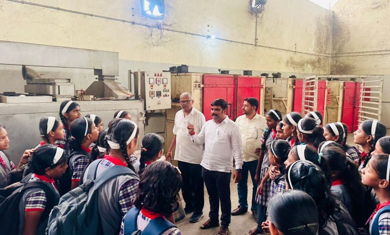दुधोंडी ; रयत शिक्षण संस्थेचे स्वामी रामानंद विद्यालय व ज्युनियर कॉलेज रामानंदनगर येथील ५ वी ते १० वी च्या विद्यार्थ्यांनी “रयत अनिवासी गुरुकुल प्रकल्प क्षेत्र भेट अंतर्गत” कृष्णाकाठ उद्योग समुहाचे संस्थापक तसेच रयत शिक्षण संस्थेचे मॅनेजिंग कौन्सिल सदस्य मा. जे के (बापू) जाधव यांच्या मार्गदर्शनाखाली चालू असलेल्या कृष्णाकाठ शेतीमाल प्रक्रिया व साठवणूक सह संस्था मर्या. दूधोंडीच्या (डी हायड्रेशन) प्रोजेक्ट ला भेट दिली, यावेळी उद्धव आरबूने यांनी डी हायड्रेशन प्रोजेक्ट ची स्थापने पासून ते आजपर्यंत प्रवासाची तसेच होणाऱ्या पालेभाज्यावर प्रक्रियाची तसेच तेथील मार्केट, नफा तोटा, प्रकल्पाचा उद्देश, इतर सर्व लागणाऱ्या गोष्टींची माहिती देण्यात आली, माहिती दिल्यानंतर विद्यार्थ्यांच्या प्रश्नांची व शकांची उत्तरे देण्यात आली, यावेळी मानसिंग बँकेचे चेअरमन सुधीर (भैय्या) जाधव यांनी उपस्थित विद्यार्थ्यांना मार्गदर्शन व संपूर्ण कृष्णाकाठ उद्योग समूहाची माहिती दिली, यावेळी कृष्णाकाठ शेतीमाल प्रक्रिया व साठवणूक सह. संस्थेचे चेअरमन जोतिराम (आप्पा) साळुंखे, मॅनेजर दिगंबर जाधव अक्षय कदम व शाळेचे सौ. पाटील सी ऐस, सौ. आटूगडे एच ऐस, श्री. दीक्षित आर ए, श्री. तांडावार एच एस, श्री. वालदे बी एस, श्री सूर्यवंशी बी एस, श्री. सावंत ए एन, श्री. पडळकर जी ए, सौ. पाटील एस व्ही, सौ. मुळे ए एस, कु. पाटील ए आर, सौ लाड के एस, सौ. तोडकर ए जे, श्री. साळुंखे एम डी व इतर प्राध्यापक, शिक्षक वर्ग व विद्यार्थी मोठ्या संखेने उपथित होते.*